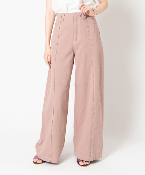配色ステッチで仕上げたチノ素材のワイドパンツ、Fond pants(フォンドパンツ)。定番のデザインですが、随所に施したステッチデザインとセンターラインのダメージ加工が、着こなしのアクセントに。また、取り外し可能なワンショルダーのレザー風サスペンダーがついており、今季らしさをプラス、ワイドシルエットながら程よいハイウエストで、ラフになり過ぎずスタイルアップを期待できる1本です。