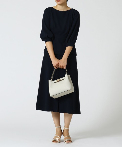 ペプラムシルエットが、デザイン性の高い万能ブラウス。きちんと感のある、上品な素材感がお出掛け着にもお仕事着にもマッチしやすいです。落ち感がありつつも軽く、しなやかな素材なので、春先まで長く着られます。タックが中央部分にあるため、すっきりと細身に見えて、スカートでもパンツでも、どんなボトムも合わせやすい丈感になっています。同素材のスカート(A0107FS229)、パンツ(A0107FP230)に合わせてセットアップで着用いただくのもおススメ◎よりキレイ目な印象を与え、オフィスはもちろん、セレモニー着としても活躍します。首が空きすぎないのでインナーを気にせずに着られて、袖にボリュームがありつつも、ジャケットが羽織れる生地の柔らかさがあるのも着やすいポイントです。