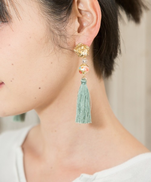 ゴールドカラーの桔梗の花と和玉を組み合わせた上品なロングピアス。歩くとタッセルが揺れて、凛とした女性らしい印象に。 優美な色合いの桔梗柄の丸玉パーツも目を惹きます。 ◆カヤ◆ 古くから伝わる日本の伝統と新しい文化の融合。 「新しいカタチの日本」に出会える倭物ブランド【カヤ】 「文明開化」をテーマに、倭モダンで色彩あふれる刺激的な和雑貨を提案していきます。 ※こちらの商品は1点1点職人による手作りとなります。その為、形や色合い・模様など若干異なる場合がございます。あらかじめご了承ください。※屋外での撮影画像は、光の当たり具合で色味・カラーが違って見える場合がございます。商品のカラーは、スタジオ撮影の画像をご参照ください。 Amina Collection Co.,LTD.