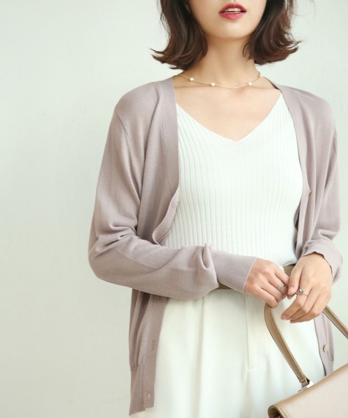 \シンプルで快適、夏にぴったりの万能カーディガン!/ カーディガンとして羽織るのも、ボタンを留めてプルオーバーっぽく着こなすのもオススメの定番サマーニットのVネックミニマル シックカーディガン。 シェルボタンのこだわり フロントにはこだわりのシェルボタンをあしらい女性らしい雰囲気に。 Vネックの絶妙な開き 胸元は適度な開きのVネックで顔周りを女性らしくスッキリ見せてくれます。 軽やかな着心地 サマーニットならではの軽やかな素材を使用しているため、夏場でも重たく感じず、快適に着用できます。 接触冷感素材を採用しているため、暑い日でも涼しく過ごせます。 ミニマルデザインの汎用性 シンプルで無駄のないデザインは、どんなスタイルにも合わせやすく、着まわし力が抜群です。 カジュアルなデニムや、エレガントなスカートとも相性が良く、1枚持っているだけでさまざまなコーディネートが可能です。 カラーバリエーションの豊富さ ベーシックなカラーからトレンドカラーまで、幅広い色展開が用意されています。 例えば、クリーンな「ホワイト」、シックな「ネイビー」、柔らかな「ベージュ」など、シーンや気分に合わせて13色選べます。 体型を気にしないシルエット ゆったりめのシルエットで、体型を選ばずに着用可能。体型カバー効果も期待できます。 ウエスト周りや肩幅を気にせず、リラックスした着心地を提供します。 季節を問わない活躍 夏場はもちろん、春や秋のちょっとした寒さ対策としても活用できます。軽量なので、バッグに入れて持ち運びも便利です。 「通気性抜群・UV対策・夏の羽織り」 「サマーニット・Vネック・冷房対策カーディガン」 「接触冷感・抜け感シルエット・大人きれいめ」 「ひんやりタッチ・デコルテすっきり・休日コーデ」 「シンプルデザイン・洗える・トラベルグッズ」 ストレッチ有りです。 商品のお気に入り登録 お気に入りの商品やサイズ・カラーまで、お気に入りの登録をしていただきますと、 そのアイテムのセールの通知、ラスト1点になった時の通知や、完売しても再入荷通知を受け取ることができます! ブランドのお気に入り登録 新商品の発売や再入荷、タイムセールやクーポン発行のお知らせなどSAISON DE PAPILLONがお届けするお得な情報を受け取ることができます! 商品の色味についてのご注意 ●ライティング等によりモデル着用画像と実際のお色味が異なる場合がございます。 ●お使いのモニターなどの環境によりお色の見え方に違いがある場合がございます。 ●素材によってサイズ感が若干異なる場合がございます。予めご了承ください。
