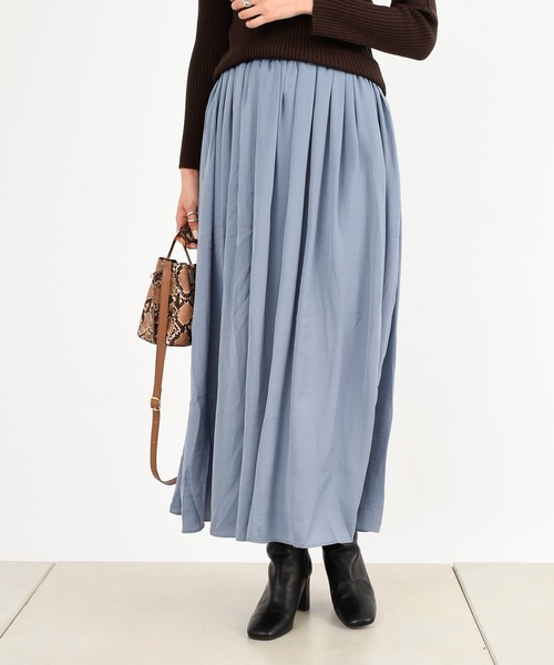 \サテンギャザースカート/光沢感のあるサテンギャザースカート。ウエスト部分にはギュッとギャザーを寄せ、流れるようなドレープが目を惹きます。 上品な光沢感のある素材を使い、女性らしい上品な仕上がりに。足首まで隠れるマキシ丈で動くたびに揺れ感が出て女性らしさをプラスします。 ウエスト部分は1周ゴムになっているので、ストレスフリーな履き心地。 女性らしい印象のロングスカートは、カジュアルからきれいめのスタイルまでオススメ。 ラフにカットソーやニット、きれいめにシャツやブラウスと合わせても◎