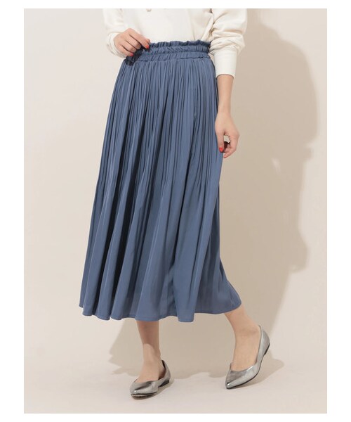 上品な雰囲気漂う消しプリーツ加工を施したサテンスカート。 エアリーな風合いが優しげな印象で、歩くたびに揺れる裾がスタイリングを華やげます。 ウエストはゴムになっているので穿き心地がよく、フリルのデザインが可愛らしいのもポイントです。