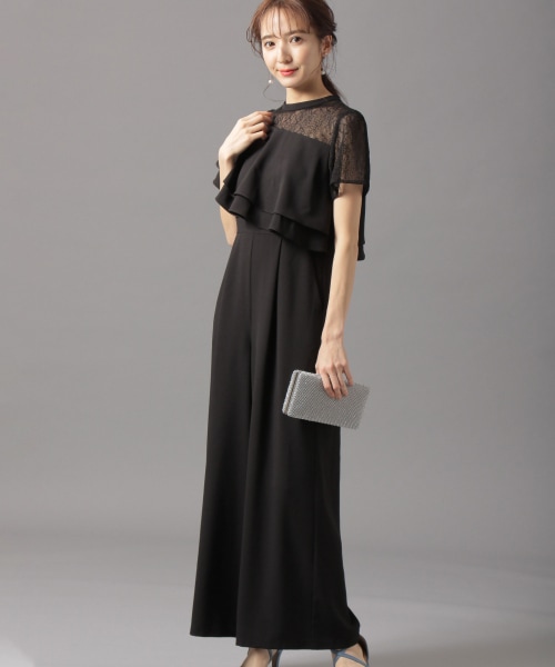 ラッフルのトップスで魅せる、クラス感のあるオールインワン。ショルダーレースで女性らしく気品もプラス。さりげなく二の腕にかかるトップスと、リラックス感あるボトムシルエットでボディラインをカバー。大人でクールなフェミニンが手に入る一枚です。結婚式、謝恩会、パーティーやレストランなど華やかなシーンに活躍します。