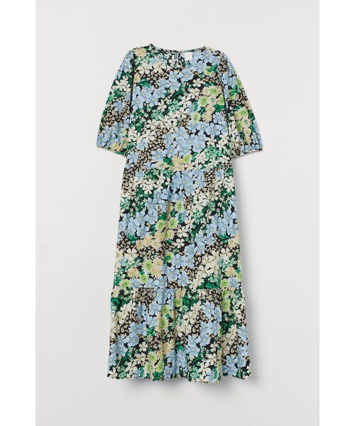 織物素材のミモレ丈ワンピース。ゆったりしたフィット。首の後ろに開きがあり、くるみボタンが1つ付いています。細いカフスが付いたショート丈パフスリーブ。ウエスト切り替え。スカート部分はフレアスタイルで、裾にワイドなフリルが施されています。