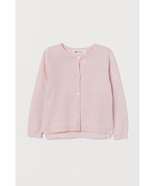 ソフトなコットンのファインニットカーディガン。長袖。フロントボタン。袖口と裾はリブ編み。両サイドに短いスリット入り。バックのほうが長くなっています。