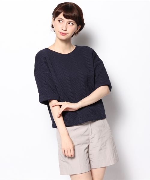 ジャカード素材を使用したゆったりめのプルオーバートップス。 ボリュームのあるケーブル編みの柄が、無地でシンプルながらも動きのある表情をプラスしてくれます。肩のラインはドロップショルダーで抜け感を出し、袖をロールアップの仕様にしているので、オーバーサイズでもすっきり見えます。程良くしっかりとした素材なのでインナー無しでも着用出来、まだまだ暑い立ち上がり時期にもオススメ! 発色の良いスカートに、そのまま合わせてさらりと着こなして。 店舗へお問い合わせの際は下記品番をお伝えください。 品番:63-04-0103-152