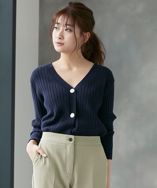 コンパクトなサイズで女性らしさが一層際立つVネックカーディガン。太めのリブニット素材で縦ラインを強調し、スッキリと見せてくれます。ホワイトのボタンでシンプルなデザインの中にアクセントをプラスしました。【素材・サイズ感】もっとりと柔らかな風合いのニット素材。おさまりの良いクロップド丈は、ハイウエストボトムやワイドパンツとも相性抜群です。シンプルデザインで着まわし力の高い万能アイテムです。