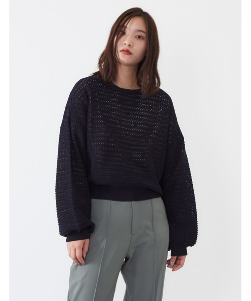 前あきのリボンディテールがポイントの、前後2WAY仕様のデザインニット。気分に合わせてプルオーバーとしてもカーディガンとしてもお使いいただけます。ほんのりドット柄のはいった透かし編みで、シーズンムードを高めます。ゆったりめのシルエットですがすっきりとした丈感になっており、さまざまなボトムスと合わせやすいバランスです。POU DOU DOU プードゥドゥひと手間加えた存在感のある「日常着」いつまでもときめきとかわいいを忘れない方への愛着を持てるワードローブ