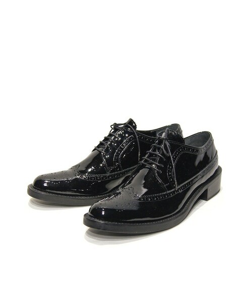 商品詳細 ウィングチップタイプのエナメルシューズになります。 製法はグッドイヤーウェルト製法で エナメルの上品な表情とグッドイヤーウェルトの堅牢な仕上がりになっております。 MATERIAL COW LEATHER COLOR BLACK SIZE S 25cm~25.5cm アウトソール30cm ワイズ15cm 高さ9.5cm ヒール4cm SIZE M 26cm~26.5cm アウトソール31cm ワイズ16cm 高さ10cm ヒール4cm
