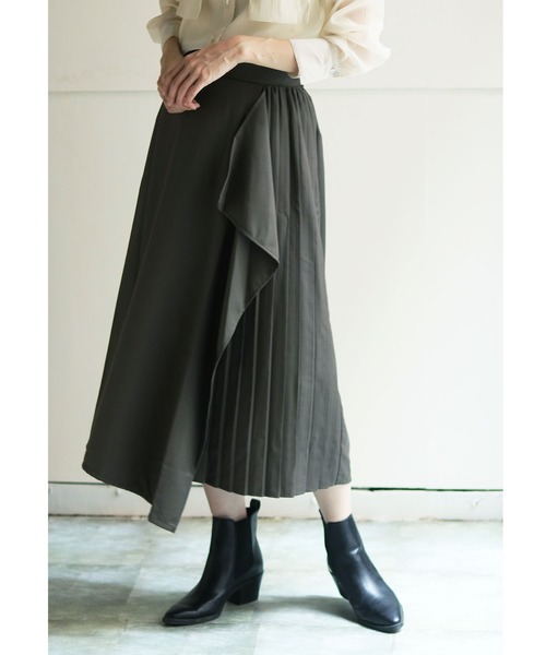 ドレープフレアとプリーツでクラス感のあるスカート【Design/Styling】たっぷりとした生地使いで女性らしいシルエットに仕上がったスカート。揺れ感のあるドレープフレアの下から覗く凛としたプリーツとのコントラストがデザイン性を高め、クラス感のあるスタイリングに。シンプルスタイルにプラスするだけで周りの差が付けられる一着です。【Fabric】落ち感のある中肉素材を使用。ほんのり光沢があり、綺麗見えするのでデイリーは勿論、ちょっとしたお呼ばれシーンにもぴったり。裏地はさらっとした手触りのものを使用。ウエストは後ろのみゴム仕様なので、デザインを崩さず着脱楽チン。■撮影場所により、実際のお色味と 若干異なる場合がございます。■商品のお気に入り♡登録を押せば『再入荷通知』『残りわずか通知』『値下げ』『クーポン発行』等のお得な情報が届きます。お気に入りブランド登録して頂ければ新商品入荷のお知らせも届きますので是非お試しください。