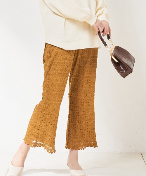 【2020SS natural couture】クロシェ風デザインが大人の上品さを引き立ててくれるレースパンツ 大人の上品さを演出してくれるクロシェ風デザインを施したレースパンツ。細かな編み地が華やかさを引き立ててくれ、取り入れるだけでこなれたスタイリングが完成します。また、程よい透け感が軽やかな印象に仕上げてくれるので、春夏にぴったり。身体のラインを拾わないシルエットで裾がフレアになっており、足元を女性らしく彩ります。トレーナーと合わせたカジュアルなスタイリングはもちろん、今季トレンドのシアーシャツと合わせた大人のリラックスコーデもオススメです。またワンピースとのレイヤードスタイルにも最適。様々なコーディネートをお楽しみ頂ける1枚です。
