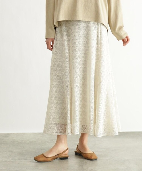 【デザイン】繊細なレースマテリアルを使用した、女性らしさ溢れるスカート。歩くたびにひらりと揺らめくフレアシルエットでエレガントムードを後押し。バックウエストはゴム仕様とし、心地の良いフィット感をプラス。足元にはパンプスやローファーなどはもちろん、あえてスニーカーで外してもトレンドライクに着こなせます。【生地感】透け感のあるレース素材。肌触りの良い裏地付きで、少し汗ばむ時季まで快適に着用できます。