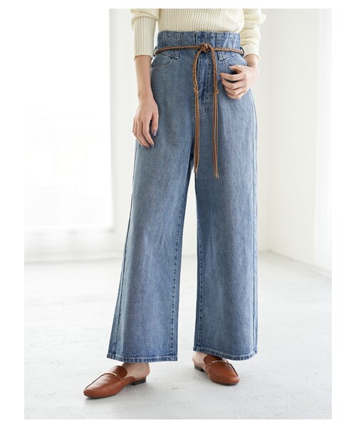 お腹周りをすっきりとした印象に見せてくれる、ハイウエストデザインのデニムパンツ。 編み込んだコードベルトも可愛らしいアクセントポイントに◎ ゆったりとしたワイドシルエットで気にある肉感も拾わず、気負いなくスタイリングできるのも魅力です。
