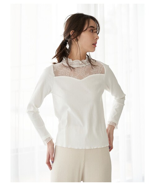 繊細なレースの切り替えがフェミニンさを薫らせるハイネックトップス。 ネックや袖口のフリルも愛らしさをプラスするアクセントに◎胸元のハートカットもキュートなポイントです。 ベースは着心地の良いリブ地を使用。縦ラインを強調する模様で、シルエットをすっきりとした印象に見せてくれる嬉しい効果も期待できます。