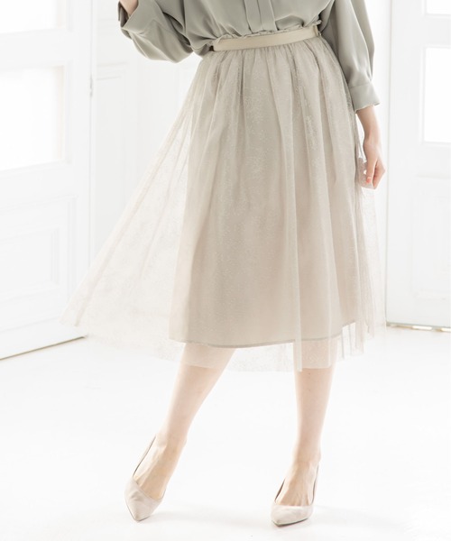 シアーなレースに透明感をプラスするため裏地にサテンを使用したオリジナルのレースフレアスカート。ウエストにグログランリボンを施し高級感をプラスしました。美しいフレアシルエットで女性らしいフィット&フレアスタイルを叶えます。軽めな素材感で春から秋にかけて長く着て頂けます。