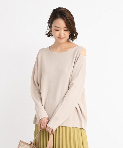 \トレンド感のある大人肌見せトップス/ 左側のショルダーにスリットが入ったプルオーバー。深すぎず適度な長さのスリットで、トレンドの肌見せスタイルを気軽に取り入れることができます。伸縮性のある生地で、さらりと着られるのも嬉しいポイント。レイヤードやベルトでウエストマークなど、長めの着丈を活かしたスタイリングが楽しめます。 ************************ ・さらっと着るだけでトレンドライクなスタイルに。 ・伸縮性があり、着心地◎ ・スカートにもパンツにも合わせやすい程よい丈館 ************************