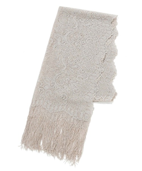 露出が気になるときに便利なレースストール。 ラメ混紡できらめきを添えた、フラワーレースストールが登場です。 華やかさと上品さを併せ持っていて、大人のスタイルにマッチするアイテム。 フォーマルルックにプラスワンで取り入れるのはもちろん、デイリーの着こなしに合わせてみるのもオススメです。 サイドはスカラップ仕上げにして、スウィートなエッセンスを加えています。