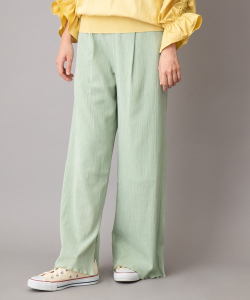 □2020 SPRING&SUMMER COLLECTION□<VERY 5月号掲載・HERS 3月号掲載>◆ふんわりとなびく、リゾートシーンにもぴったりなリラックスパンツ◆<MATERIAL>清涼感と肌離れの良さが特徴の<楊柳>素材です。楊柳:ヨコ糸に「強燃糸」を用いてシボを出したて方向に縮ませた織物を差します。このたて縮みが涼しさをだし、通気性も高めてくれるのでベトつかず、さらりとした清涼感のある肌触りになります。適度に張り感があり、ストレッチ性もあるのでカジュアルなアイテムにもぴったりな素材です。<DESIGN>パンツの裾内側にスリットが入っているので、歩くたびにふんわりとなびくセミフレアパンツ。ウエスト部分はゴム仕様でストレスフリーな履き心地に仕上げました。楊柳素材の清涼感が春夏のリゾートシーンまで活躍しそうな上品な大人の余裕を感じさせるリュクスなパンツです。裏付きなので透けの心配もなく明るいカラーリングを楽しめます。同素材のブラウス(MN201U14)やワンピース(MN201U16)をセットアップで着用すれば、今年らしくヌケ感たっぷりの着こなしができるのでおすすめです!<COLOR>■アイボリー:やさしい印象のエクリュ。素材の持つシボ感の陰影をナチュラルに表現してくれる着回しやすいカラーです。■ブラック:シックで着やせ効果バツグンのブラック。ブラックカラーと縦シワの組み合わせでよりすっきりとした印象に仕上がっています。■ライトベージュ:グレイ寄りのクールなライトベージュ。明るめのカラーなので、素材が持つシボ感の陰影を表現してくれるカラーです。■ライトグリーン:トレンドのライトグリーン。春夏らしいさわやかで華やかな印象ですが、不思議とスタイリングになじむ使いやすいカラーです。*お取扱いについては、商品についております品質表示にてご確認ください。洗濯:手洗い可.............................≪INFORMATION ≫............................▼商品のお気に入り登録▼『♡』マークを押してお気に入り登録して頂いた商品は、セール開催の通知やクーポン発行などのキャンペーンなど、お得な情報をいち早く受けとる事が出来ますので、ぜひご登録ください。