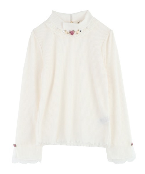 ネック部分のサテンリボンでできた巻きバラが可愛らしいカットプルオーバー。ストレッチのきいた素材できやすいアイテム。お袖のレース使いもさりげないポイントでカーディガンなど羽織をあわせちょこっとレースをだしたスタイリングがおすすめ。