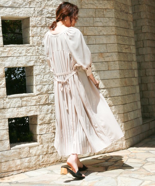 軽やかに着たいバックプリーツガウンワンピースキレイ目に着て頂ける、透け感楽しむアイテムとなっております♪※屋外の光や照明の当たり具合、パソコンなどの閲覧環境によって実際の色味と異なって見える場合がございます。予めご了承ください。