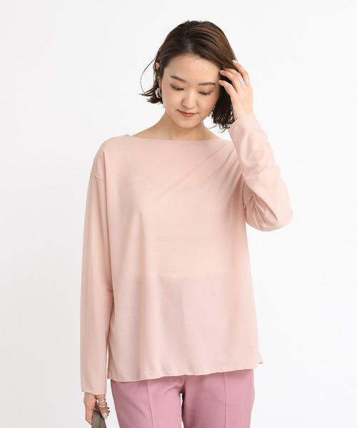 \今年のトレンド!シアートップス/ワンランク上のレイヤードスタイルが楽しめるシアー素材のプルオーバー。鎖骨がきれいに見えるボートネック部分、袖口や裾は波打つようなメロウ仕上げで、スウィートエッセンスが盛り込まれています。タイトすぎずルーズすぎない程よいフィット感で、着心地も抜群。これからの季節に活躍する軽やかな印象のアイテムです。*********************・トレンドの透け感のあるシア-カットソー・程よい透け感が女性らしく華奢に見せてくれます!・シャツやニットのインナー代わりに・インナーを透けさせ、一枚で着ていただいても◎・デコルテがキレイにみえるボートネック仕様*********************