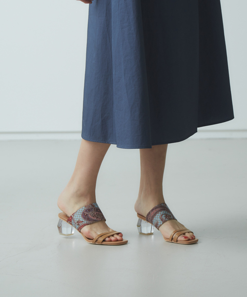 クリアの変形ヒールが可愛い新作サンダル 今季も大注目のスカーフ柄やクリア素材をミックスさせた心躍るデザイン♪履くだけで足元を華やかに彩り、合わせるペディキュアの色やスタイリングを考えるのも楽しくなる1足です。 また、ベースはベーシックなカラーを使用しているので意外とコーディネートしやすいのも嬉しいポイントです◎