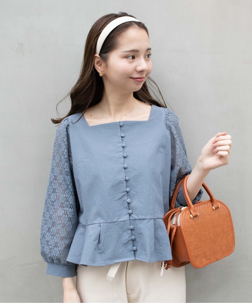 繊細な花柄レースが目を惹く華やかブラウス。コットン素材と組み合わせナチュラルな雰囲気に仕上げました。高めの位置で切り替えたペプラムでスタイルアップが叶います。さりげなく腰回りをカバーしてくれる効果も!フロントにはくるみボタンを並べてポイントに。甘めなデザインとすっきりとしたスクエアネックのバランスが◎!デニムとの相性も抜群で大人かわいい着こなしにマッチする1枚です。