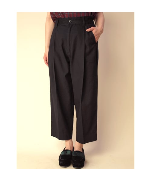足首が出てスッキリとした印象で履ける8分丈のデザインが◎なクロップドパンツ。特にもも部分はゆったりとしているデザインですが、センタープレスが入ったデザインなのですっきり綺麗に着て頂けるオススメの1枚です。※ウエスト後ろはゴムになります。