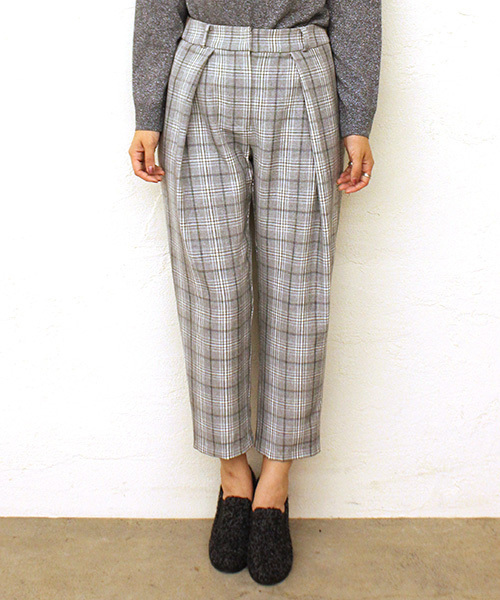 Omekashi トラッドな印象のチェックのスラックスパンツ。タック入りデザインですっきりと着こなせるアイテムです。 パンプスと合わせてシックに、スニーカーと合わせてカジュアルに着るのもお勧めです。