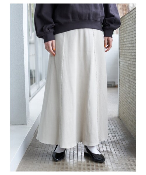 切り替えすることで、ふわっと広がるフレアシルエットに仕上げたロングスカート。 細畝のリブ地がすっきりとした印象に見せてくれる効果も。ウエストはゴム仕様で安心感のある穿き心地。 装飾のないミニマルなデザインでコーディネートに取り入れやすく、ワードローブの定番アイテムとしても活躍してくれそう。