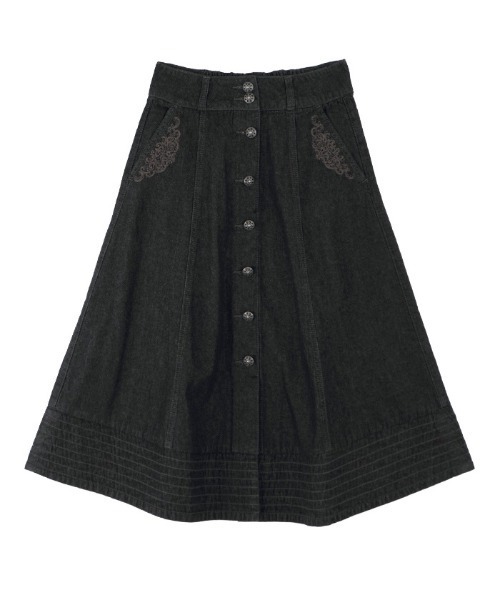 デニム素材に刺繍やクラシカルな釦デザインを落とし込んだaxesfemmeらしいデザインのスカート。広がりすぎずすっきりとしたシルエットが◎。前釦は上4つまで外すことができるので着脱も楽チンです。トレンドのレーストップスやジャケットスタイルなどエレガンスMIXなスタイリングがおすすめ。