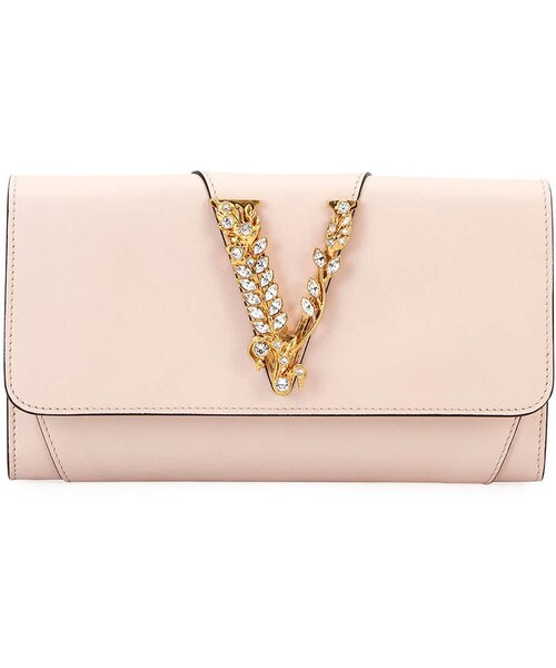 Versace wallet/crossbody bag in calf leather, featuring prominent baroque crystal "V" ornament. Removable chain shoulder strap. Flap top with snap closure. 5.5"H x 8.7"W x 1.6"D. Made in Italy.