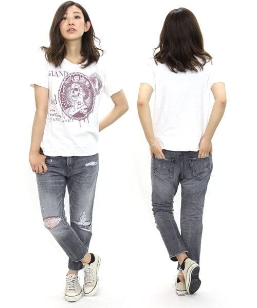 程よいダメージを施したノンストレッチのタイトデニムパンツです☆フラット仕様のヒップ部分に、裾にかけてスッキリ見えるテーパードラインを合わしたボーイッシュな仕上がりです!ブルー&ブラックデニムでより男の子っぽいコーデを演出、バックスタイルの刺繍と加工で表現されたニコマークでキャッチーさをプラス♪