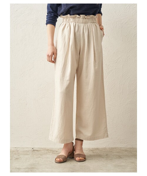 フレンチリネンとレーヨンをブレンドした、上質ムード漂うワイドパンツ。 ゆったりとしたフォルムで女性らしさをメイク。ナチュラルな風合いで、ほどよく肩の力が抜けたリラックスムード漂うスタイルに。 シンプルなデザインでコーディネートに取り入れやすく、オンもオフも幅広く着こなしを楽しめる1着です。