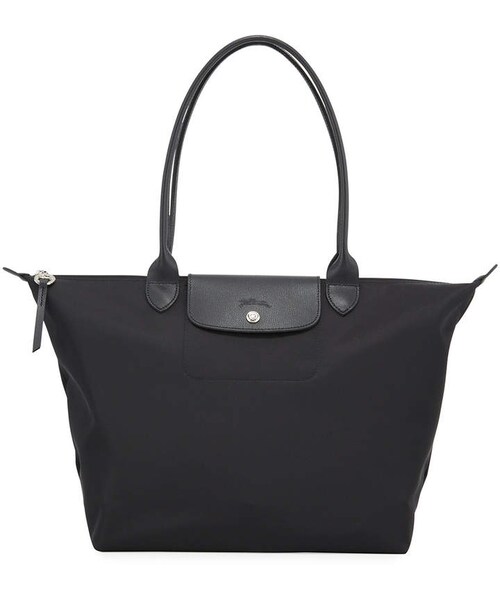 Longchamp tote bag in durable, lightweight nylon canvas with leather trim. Shoulder straps with 9" drop. Zip top. Inside, unlined; slip pocket under flap. Folds up into a small pouch. 12.3"H x 11.8"W x 7.5"D.