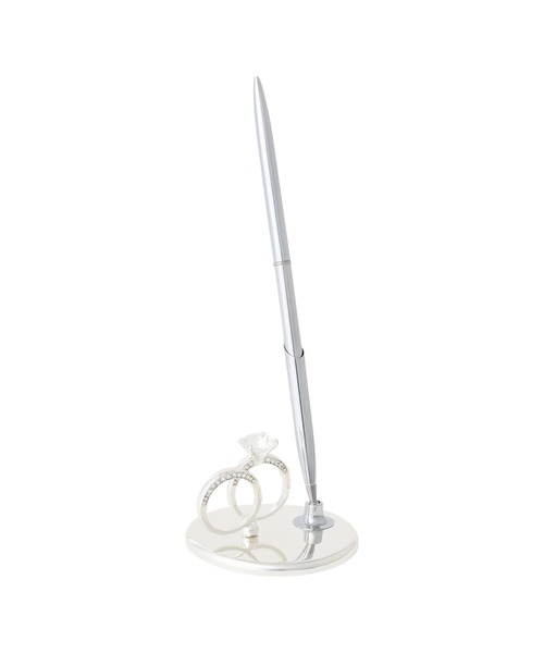 指輪のモチーフが上品なデスクペンです。 ペアのリングがウェディングをイメージしているので、結婚式の受付にぴったりのデザインです。また、これから結婚を控えている方へのプレゼントとしてもおすすめです。 【注意事項】 ■手作りのため、商品の仕上がりには個体差があります。 ■衝撃により破損したり、装飾が剥がれることがありますのでお取り扱いにご注意ください。 ■サビが発生する恐れがありますので、濡れた手で触らないでください。 ■ペンと土台の接続部が破損する恐れがありますので、過度にまわしたり無理な方向にペンを倒したりしないでください。 ■安定性のある場所でご使用ください。 ■接触面を痛める恐れがありますので、商品を引きずらないでください。