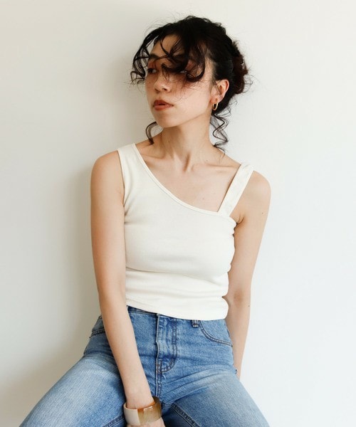 ◆トレンド感たっぷり!着回ししやすいアシメインナー 【特徴】 Holiday大人気のリブインナーシリーズに新作が登場! アシメトリーの形が印象的なコットンインナーです。 ジャストフィットの心地よいサイズ感で、首元や後ろ開きのアイテムに相性がよく、 春夏のファッションが気軽に楽しめます♪イチオシ商品です♪ 【スタイリング】 デニムにリネンシャツやシアーシャツと合わせ、透け感を出して涼しげなファッションと合わせて デイリーユースにお使いいただけます♪ 一枚で着れるアイテムなのでガウンのトップスとしても万能です!