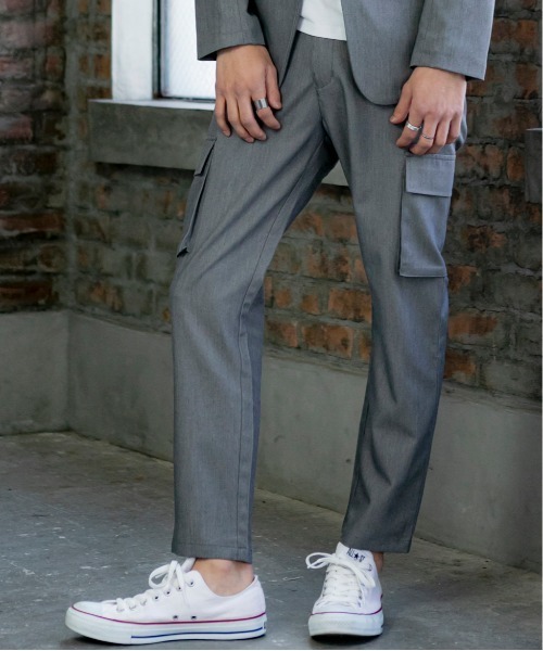 テーパ-ドパンツもリラックス風味で楽しむ!!定番のテ-パ-ドデザインですが、やりすぎないややルーズ感でテーパ-ド初心者の方でも試しやすいシルエットになっています! カーゴ仕様になっているので、プレーンなテーパードパンツとは一味ちがったデザイン味がポイントです。 履くだけで今どきのトレンド感を作ってくれる心強いアイテムです! サラっとした履き心地のT/R素材(ポリエステル/レーヨン)で、シーズンレスなのもうれしい! 程よくハリコシのある素材なのでシルエットもスッキリきれいにキマります。 丈も長すぎない絶妙なバランス良い仕上がりです! ストレッチ入りで伸縮性もあるので履き心地も○ Tシャツやスニ-カ-を合わせるだけでヌケ感のある旬なスタイルが完成! ジャケット合わせは、ラフでリラックスだけど清潔感あるキレイめなコーデが完成しますよ! イ-ジ-ケアな素材だからお手入れも簡単なのも嬉しいですよね。