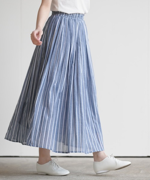 清涼感たっぷりなふんわりストライプスカート 爽やかなストライプ地のスカート。 ふんわり柔らかなコットンボイルで絶妙なボリューム感を演出してくれます。 長め丈でスタイリングをこなれた印象に。 また軽やかでエアリーな表情がシーズンムードも盛り上げてくれます。 裏地もコットン布帛で汗ばむ季節も快適♪ 裏地あり 伸縮性なし 薄手 ウエスト総ゴム(紐入り) インド生産 (インド製品特有の色柄、風合いのため多少の色むら、織りキズ等は商品の特徴の一つですので、予めご了承ください) 洗濯:洗濯機使用可(ネット使用)