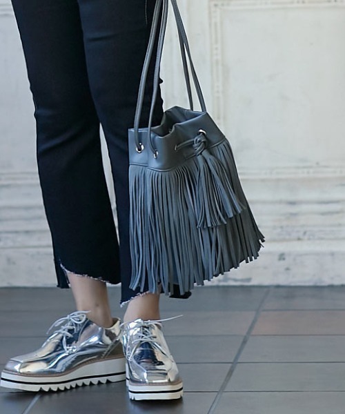 コロンとした巾着型が可愛らしい。華やかでコーディネートのスパイスになるフリンジバッグです。合わせるだけでトレンド感のあるコーデに。【素材・サイズ感】マットな合皮に同色のスエード素材の組み合わせ。ストラップの引き出し方により、手提げもショルダー使いもできるのもうれしいポイント。内側ポケット:1