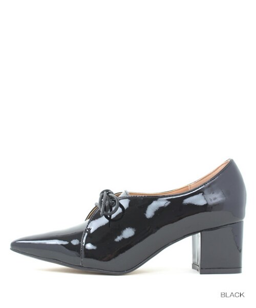 レースアップのポインテッドシューズです。ポインテッドトゥにデザインして、スタイリッシュな印象にメイク。光沢のあるエレガントな素材なので女性らしさのあるアイテムです。太めのヒールなので安定感ある履き心地です。140804素材:合成皮革(エナメル・スムース)