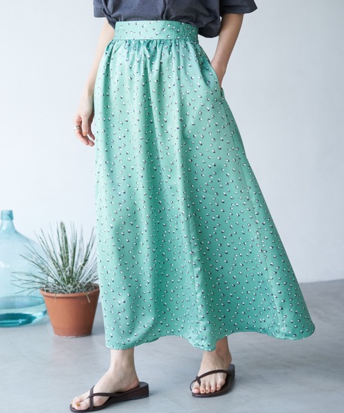 シックなカラーに小さめの柄で品よく仕上げたフレアスカート。ふんわりと寄せられたギャザーで動きのあるシルエットにはスタイルUP効果も。なめらかな手触りのサテン生地を使用。落ち着いた柄が大人っぽくもこなれ感たっぷりな1枚です。