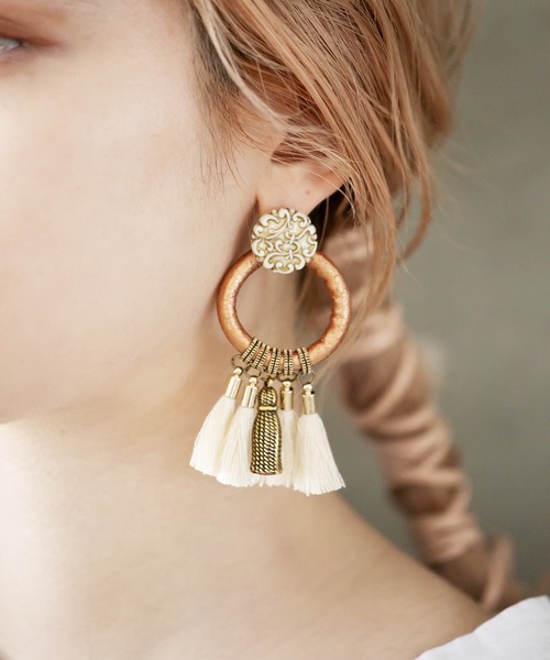 ヴィンテージ調のドイツ製ビーズと希少なアンティークパーツを贅沢に使用したミニタッセルピアス。 ラウンドのレザー使いが特徴的で、横顔を美しく演出してくれるバランスでデイリー使いにはもちろん、結婚式やパーティーシーンにも◎ *キャッチとポスト(軸)部分にはアレルギーにも配慮したシルバー925を使用。ノンニッケル(ニッケルフリー)仕立てです。 *上質なシルバー925を使用しているため、素材は柔らかいので、お取り扱いにはお気を付けくださいませ。 (もしご納品時にポスト部分が少し曲がっているようでしたら、少し力を入れていただければ元に戻すことが可能です。) 【BOEMY】(ボエミー) 2020SSスタート 自由きままを意味するBoheme+Myの造語。 ◆ ブランドコンセプト ◆ 「自由な自分スタイル」 自分のスタイルを大切にしている大人の方へ 日常をより美しく、楽しくさせてくれる商品をお届け ◆ テーマ ◆ Vintage mood,Mode mix… *撮影環境によりスマートフォン、パソコンなどの画面上と実物では多少色味が異なることがございます。 *商品の特性上、色や形に多少の個体差がございますので予めご了承ください。 *アクセサリーは壊れやすいものです。取扱いにご注意ください。 ▼ 商品お気に入り登録 ▼ 右のハートをクリックすると、お気に入り登録アイテムの再入荷・在庫ラスト1点等の通知を受け取れます。 フリンジ/フリンジピアス/個性的/大ぶり/本革/結婚式/二次会/フォーマル/オケージョン/