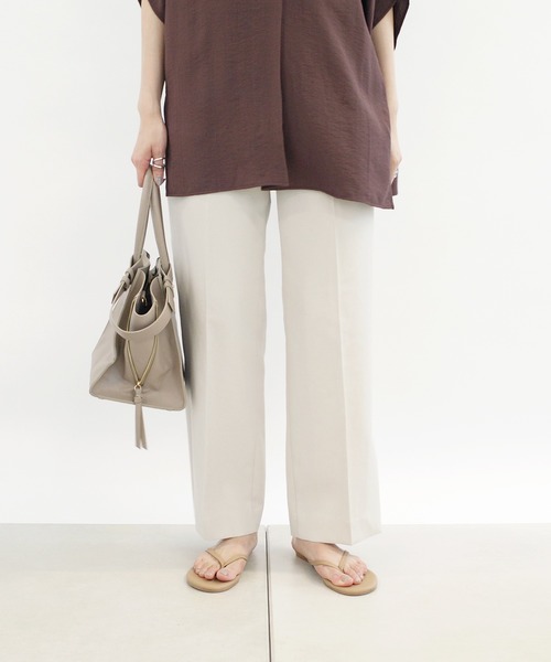 \美脚シルエットパンツ/程よく足回りに余裕がある、ストレートラインのセンタープレスの入ったきれいめパンツ。裾サイドにスリットが入り、少しセミフレアのようなシルエットが今年らしいアクセントに。スタイリングのポイントとなるカラー2色と合わせやすいオフベージュの3カラー。さらっとした生地感が着心地も軽く◎合わせるトップスによって、カジュアルにもフェミニンにもコーディネートしていただける一本です。 ********************* ・足がスッキリ美脚効果のあるシルエット ・さらっとした生地感がシワになりにくい◎ ・サイドスリットでトレンド感UP ********************* ※サイドスリットパンツ(品番:DDZ1001302A0003)と同じ商品ですが、ポケットのデザインのみ少し違いがございます。