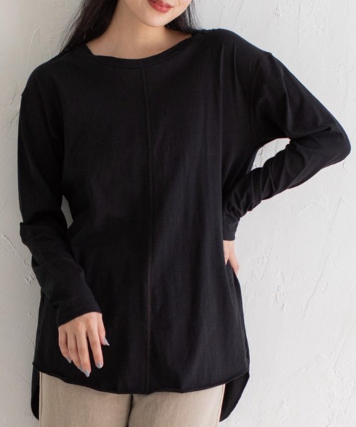 こなれゆるっと。シルエットが可愛いロングTシャツ <MATERIAL>コットン100%の柔らかとろける肌触り。 インナーが透けにくくでも軽やかさを感じるこれからのシーズンにマストな使いやすい生地感です。 とろみある柔らかさはレイヤードにもぴったりな肉感です。 <DESIGN> メンズライクなシルエットに新鮮さを感じるこなれカラーの組み合わせなのにどこか女の子らしいカットソー。 ラウンドのヘムは重ね着スタイルの時にちょっこっと裾からでる絶妙丈!レイヤードスタイルの程よいアクセントになります。 人気のパーカー重ねももちろんですがニットベストなどを重ねて最旬スタイルが即完成します♪ 少し大きめなサイジングと使いやすいグレイッシュなトーンは彼氏とのおそろコーデも楽しめそう!主張しすぎない、でも着ると間違いなく可愛いユルシルエットはミサリナの御自慢アイテムです。 STAY HOMEのお部屋着にもピッタリです <COLOR> オフホワイト:柔らかな雰囲気の生成りオフホワイト。 ブラック:引き締めブラック。程よい艶感のハンサムなブラックです。 サックスブルー:グレイッシュなアイスブルーは可愛くなりがちな水色トーンを大人っぽい雰囲気に格上げしてくれます。 ベージュ:大人感じる絶妙くすみベージュはこなれたコーデにまとめてくれる人気のカラーです。 <CARE> ※詳しくは製品に付属している洗濯表示をご参照ください。 ※撮影環境により、多少実際のカラーと異なる場合がございます。 また、携帯やスマートフォン、パソコンなどの画面上と実物では多少色が異なって見える場合がございます。