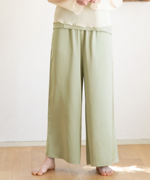 春色カラー&サテン素材で、トレンドライクなワイドパンツ。程よい光沢のあるサテン生地で、今シーズン欠かせないサテンワイドパンツ。レーヨン特有の落ち感とドレープが特徴で、ラフなニュアンスがとても上品な雰囲気です。サラッとした生地は、春夏シーズンに適した素材感です。ややゆるめのシルエットで楽ちんな履き心地はもちろんのこと、とろみのある生地はウエストゴム仕様でももたつかず、きれいなシルエットでお召しいただけます。同シリーズのキャミソール&シアートップスを合わせると、セットアップのコーディネートが完成。今年トレンドのシアートップスやオーバーサイズのトップスや、ワンピースの裾から覗かせるレイヤードスタイルにもおすすめです。透け感は無く1枚でも安心してお召しいただけます。お家の中でのリラックスタイムにも、ちょっとそこまでのお出掛けにも活躍すること間違いなしの一枚です。【同シリーズはこちら】※【】の中の番号で検索してくださいサテンキャミ付きシアートップス【885822】サテンキャミ付きシアートップス/半袖【912522】《インフォメーション》◆商品のお気に入り登録完売していても再入荷時に再入荷通知を受け取ることができます!是非ご登録ください♪◆ブランドのお気に入り登録新商品や再入荷などの情報を受け取ることができます!ぜひご登録ください♪
