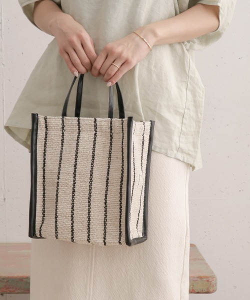 インド製の麻混素材が夏のスタイリングにプラスしたいボックス型のバッグ。 マチがしっかりとあるため内容量も十分。 手持ちだけではなく、取外し可能なショルダーストラップを備え、シーンで使い分けることができます。 ※この商品は、水分や汗、摩擦(特に湿った状態での)などにより、色落ちや色移りすることがありますので、着用時・クリーニングの際は充分ご注意下さい。特に濡れたまま放置しますと、他のものに色移りしたり、色泣きすることがありますのでご注意下さい。 ※直射日光や蛍光灯に長時間あたると変色したり、色褪せすることがありますのでご注意ください。 ※その他お取り扱いに関しましては、商品に付属のアテンションタグをご覧ください。 総重量 : 約460g