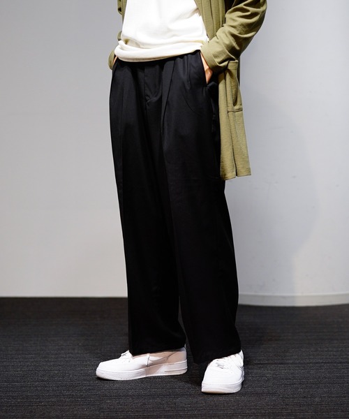 COOLなワイドシルエットパンツサラッとしていて清涼感のクールサーフェイスを使用したワイドスラックス。 タックやストレートのボリューム感など脚をキレイに見せてくれるのシルエットにこだわりました。 ワイドパンツなので肌触りもベタつかず快適な履き心地になっていますので毎日履きたくなるパンツです。 無地なので柄やカラーアクセントのアイテムをトップスに持ってきても、しっかりまとめてくれます。