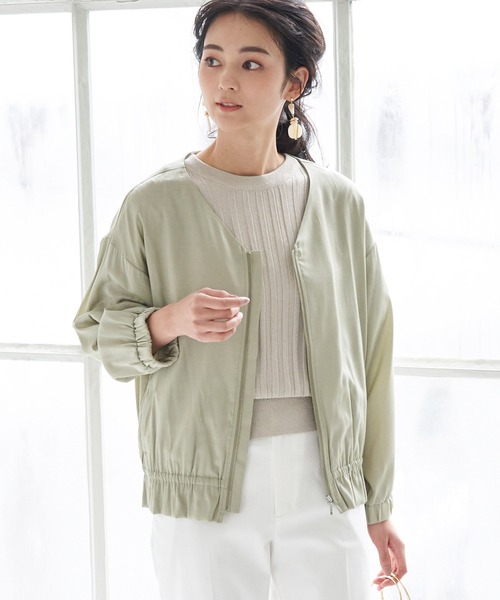 カジュアルとエレガントのバランス感がちょうどいい◎。これからのシーズンに嬉しい、UVカット機能付きのライトブルゾンです。手軽に羽織れるジップアップデザインで、さり気ない裾のフリルがフェミニンさを引き立てます。軽快なレングスは、インナーやボトムなど合わせるアイテムを選びません。リサイクルポリエステルを使用した、エコな取り組みもポイントです。・裏地なし。※撮影時の光によって色の見え方が異なる場合がございます。