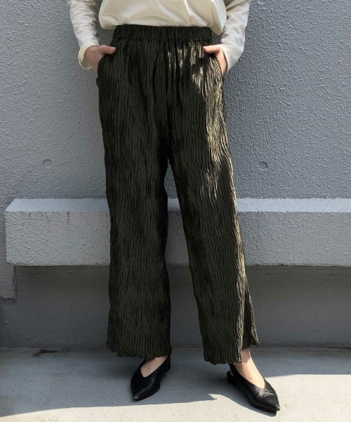 トレンド感とこなれ感のあるデザインパンツ。 さらりとした生地に立体的なシワ加工と ほんのり光沢感が施されており、 動きのあるシルエットが楽しめます。 ワイドなシルエットで履き心地も良く ウエストゴムで楽に着ていただける一本です。 くるぶしが隠れるロング丈の裾はメロウデザインで 着こなしにアクセントを与えてくれます。 ロングシャツやワンピース等で レイヤードしたスタイルにオススメのアイテムです。 ※撮影場所や明るさにより 実際の商品と色味が若干異なる場合がございます。 ☆商品のお気に入り♡登録を押せば ”再入荷通知”や”残りわずか通知” 値下げのお知らせが届きます! お気に入りのブランド登録していただければ新商品入荷のお知らせも届きますので 是非登録してみて下さい。
